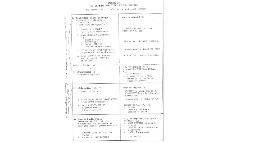 A typical assessment of a case using the German method of analysis will thus look like this: 1. Definitional elements of the offense a) objective b) subjective 2. Wrongfulness (usually indicated by definitional elements being fulfilled) a) ground for justification 1) b) ground for justification 2) 3. Culpability (legal age etc. , usually presumed, unless doubtful) a) any other obstacles exluding culpability, e. g. intoxication beyond a certain level b) ground for excuse 1) c) ground for excuse 2) [4. Depending on the type of offense, and in very rare cases, something might come into play that is called „objective condition of punishability“].