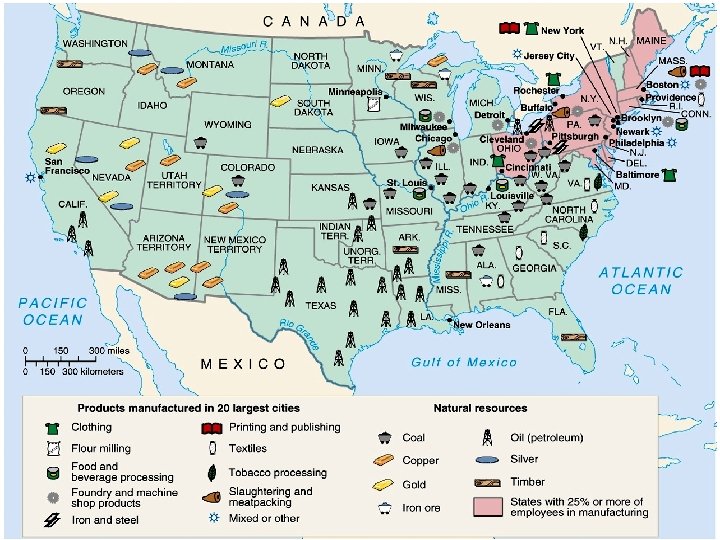 Causes of Rapid Industrialization 4. Unskilled & semi-skilled labor in abundance. 5. Abundant capital. 6. New, talented group of businessmen [entrepreneurs] and advisors. 7. Market growing as US population increased. 8. Government willing to help at all levels to stimulate economic growth (government intervened). 9. Abundant natural resources.