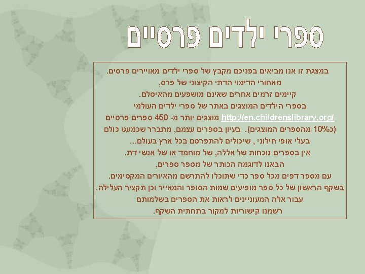 In Search of Childhood Author - Mahdokht Kashkouli Illustrator - Nasrin Khosravi En busca de la niñez Un cuervo busca un lugar agradable para vivir. ילדים ימצאו בה דירה העורב לו תר יאהבוהו והמה , יאהב אותם Publication Date 1378 (1999) http: //www. childrenslibrary. in search of childhood