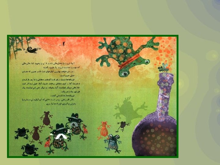 The beautiful pond Author - Kambiz Kakavand Illustrator - Ali Reza Goldouzian Summary Speckled Frog used to sing differently so the other frogs poured a "song syrup" into her mouth that made her silent. A little fish discovered a flute at the bottom of the pond and brought it to her and asked her to play. Speckled Frog played very well, and everyone in the pond enjoyed her music. La Rana Moteada, solía cantar muy diferente, por lo que las otras ranas, vaciaban un "jarabe de cantos" en su boca que lograba mantenerla en silencio. Un pequeño pez descubrió una flauta en el fondo del estanque y se la dió a la Rana Moteada quien la tocó muy bien, y todos los habitantes del estanque disfrutaron של מזו הייתה שונה המנומרת הצפרדע של שירתה הצפרדעים נסכו " שירה של "שיקוי לכן . חברותיה מתחתית העלה קטנטן דג . . . שהשתיקה לגרונה הפליאה וזו המנומרת לצפרדע מסרו , חליל השלולית . שומעיה כל את ולענג בו לנגן Publication Date 1382 (2003) Languages http: //www. childrenslibrary. the beautiful pond Persian / Farsi
