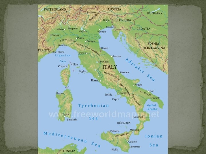 Geography. Locus-Locus � Middle of the Mediterranean � Larger and more arable land than Greece- mts north and south � River valleys- Po in the North, Tiber in middle of boot � Rome - inland accessible by boat- defensible, on “Seven Hills” � Capitoline � Quirinal � Viminal � Esquilin � Cælian (Coelian/Celio) � Aventine � Palatine