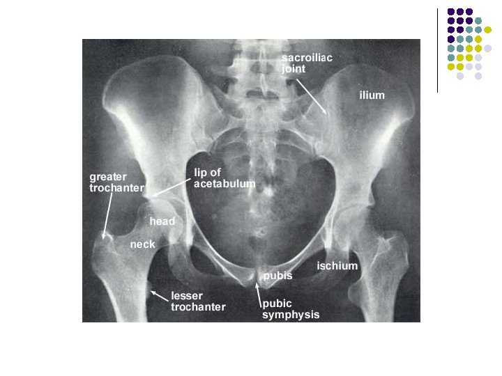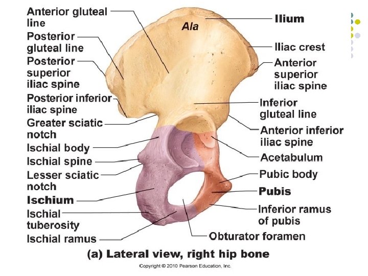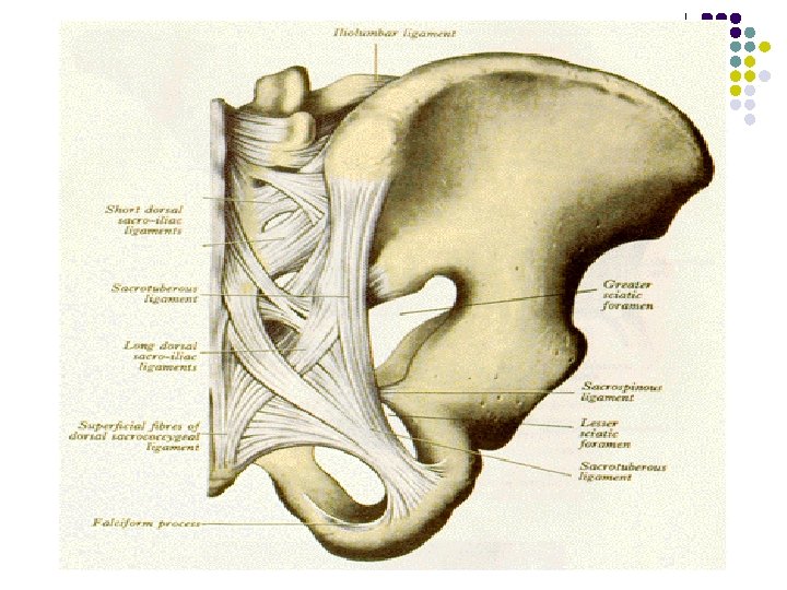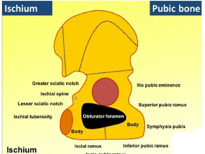 The ischium l l L shaped The body l l The ramus l l A lower thinner part, The ischial spine l l An upper thicker part Projects from the posterior border of the ischium and intervenes between the greater and lesser sciatic notches. l Converted into greater and lesser sciatic foramina by the presence of the sacrospinous and sacrotuberous ligaments The ischial tuberosity l Forms the posterior aspect of the lower part of the body of the bone.