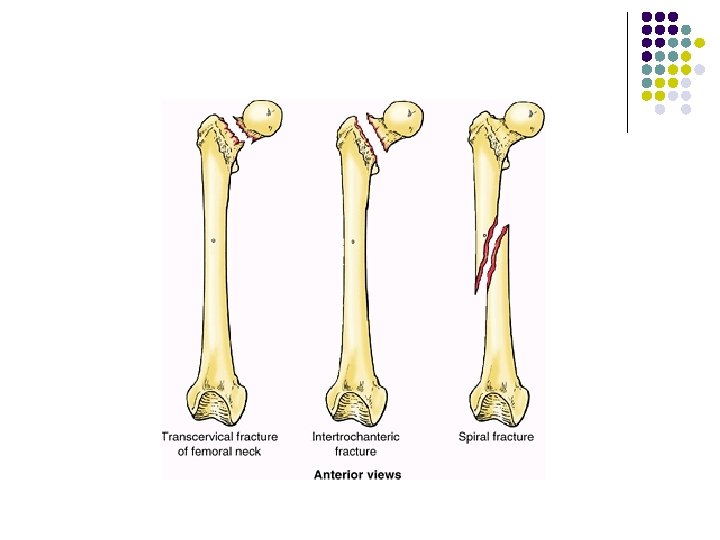 Subcapital Fracture l l Fractures of the neck of the femur are common The subcapital fracture l l l occurs in the elderly (common in women after menopause ) usually produced by a minor trip or stumble. Avascular necrosis of the head is a common complication. If the fragments are not impacted, considerable displacement occurs. The strong muscles of the thigh including the rectus femoris, the adductor muscles, and the hamstring muscles, pull the distal fragment upward, so that the leg is shortened The gluteus maximus, the piriformis, the obturator internus, the gemelli, and the quadratus femoris rotate the distal fragment laterally, as seen by the toes pointing laterally.