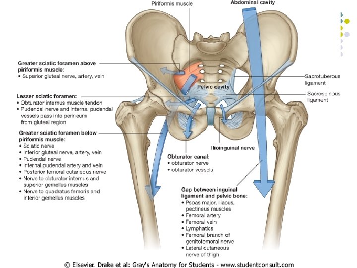 Greater Sciatic Foramen l l l Formed by the greater sciatic notch of the hip bone and the sacrotuberous and sacrospinous ligaments. It provides an exit from the pelvis into the gluteal region. The following structures exit the foramen 1. Piriformis 2. Sciatic nerve 3. Posterior cutaneous nerve of the thigh 4. Superior and inferior gluteal nerves 5. Nerves to the obturator internus and quadratus femoris 6. Pudendal nerve 7. Superior and inferior gluteal arteries and veins 8. Internal pudendal artery and vein
