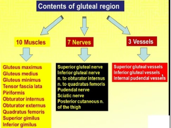 l The gluteal region contains: l Bones l Ligaments l Muscles l Vessels l Nerves