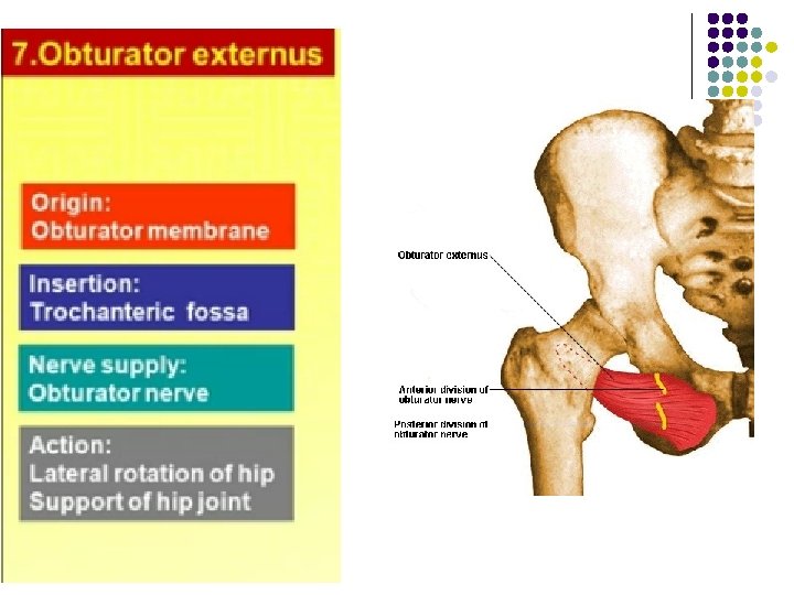 SIX LATERAL ROTATORS Piriformis. l Obturator internus. l Gemelli (superior and l inferior ). Obturator externus. l Quadratus femoris. l