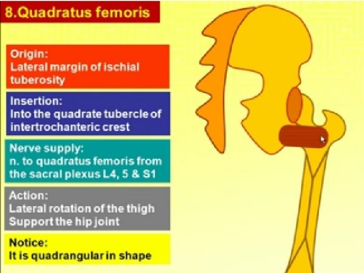 Gemellus Inferior l l The gemellus inferior is a small muscle. Origin: l l Insertion: l l With the tendon of obturator internus Nerve supply: l l Upper margin of the ischial tuberosity. Nerve to the quadratus femoris from the sacral plexus. Action: l Lateral rotator of the thigh at the hip joint.