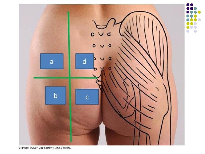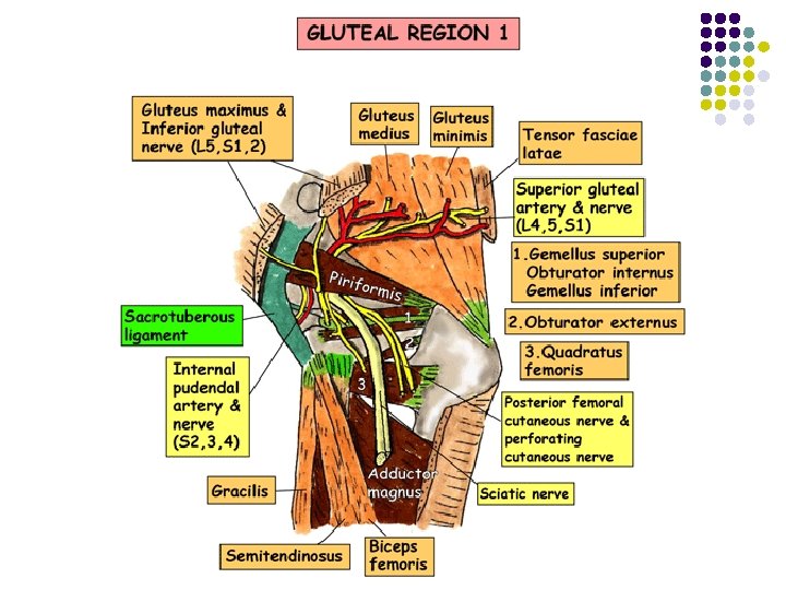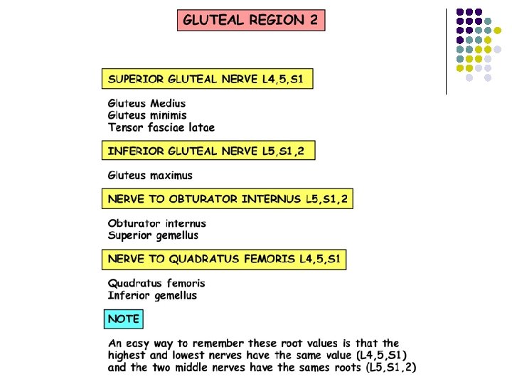 Cutaneous Nerve supply: l l l Upper lateral quadrant: Lateral branches of iliohypogastric (L 1) and T 12 Upper medial quadrant: Posterior rami of L 1, 2, 3 & S 1, 2, 3 Lower lateral quadrant: branches from lateral cutaneous nerve of thigh (L 2, 3) Lower medial quadrant: branches from posterior cutaneous nerve of thigh (S 1, 2, 3) Skin in the floor of the intergluteal cleft: branches from lower sacral and coccygeal nerves Dermatomes