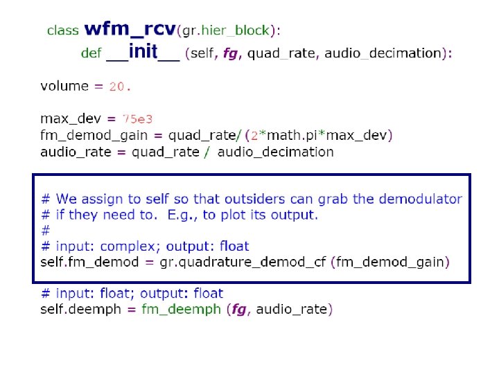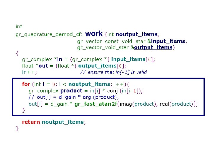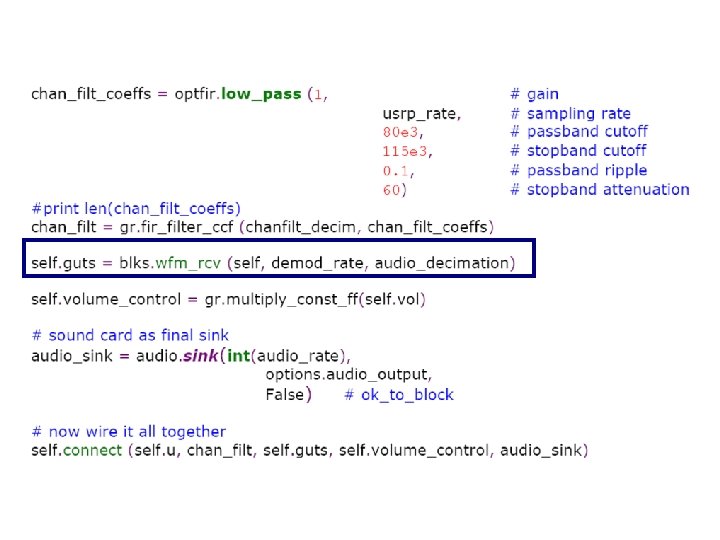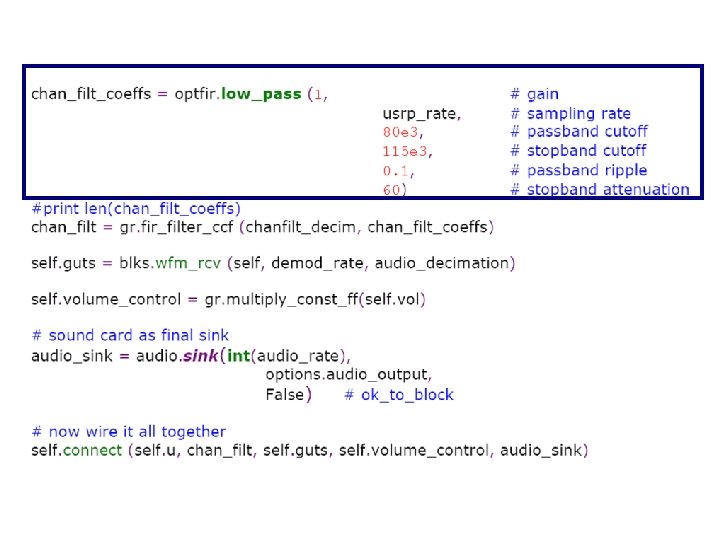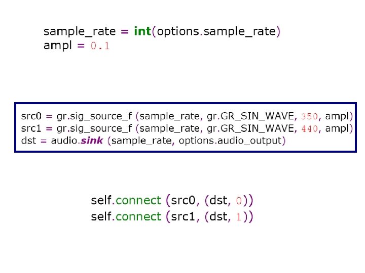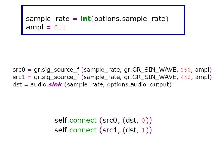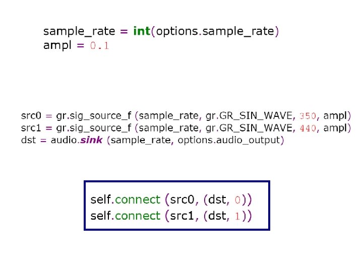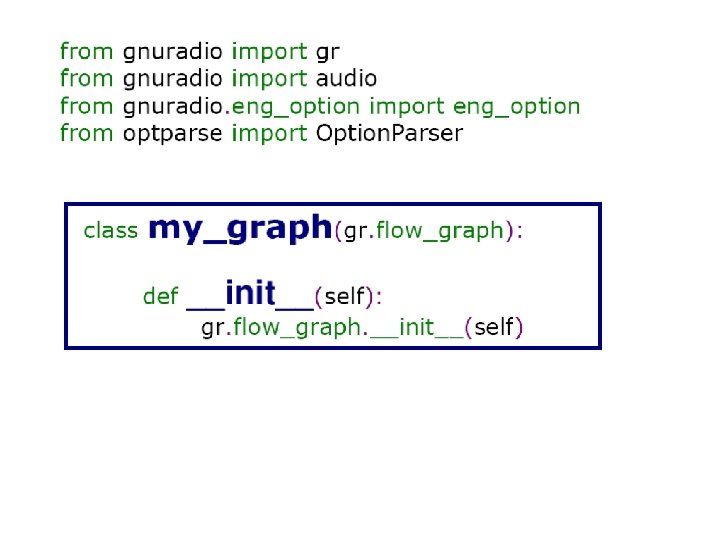 GNU Radio Software Architecture • Library of signal processing blocks (C++) – Ex: sources, sinks, others • Input, output ports, types, ‘work function’ • Create a ‘flow graph’ : vertices are blocks and edges represent the data flow (Python) • SWIG, FFTW, Boost …