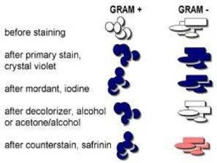 The Gram stain Thin smear/heat fix Gram stain: a. Flood slide with crystal violet and let stain for 1 minute. b. Drain off crystal violet and rinse off with distilled water; flood slide with Gram's iodine for 1 minute. c. Rinse off Gram's iodine with distilled water. d. Hold the slide on an angle (preferably with a clothes pin) and drop 95% ethyl alcohol onto it until the alcohol leaving the slide no longer has a purple tint; be sure to drop the alcohol onto the upper portion of the slide so that the smears are subjected to uniform decolorization. Be careful not to "decolorize" dye from the clothes pin!! e. Rinse with distilled water and flood the slide with safranin and let stain for 2 -3 minutes. f. Rinse with distilled water and blot dry with bibulous paper. Gram positive Gram negative