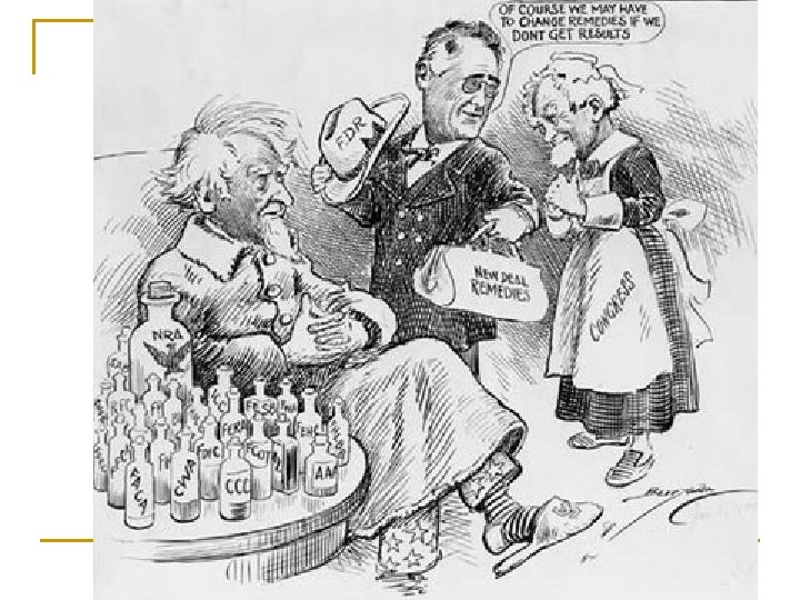 New Deal Legislation (Alphabet Soup) n n Hundred Days – period in 1933 when FDR pushes programs through Congress FDR passed laws – 3 R’s – Relief, Recovery and Reform q q q Relief – provides jobs to unemployed Recovery – government spending to put money back in the economy Reform – changes laws to fix and prevent another depression