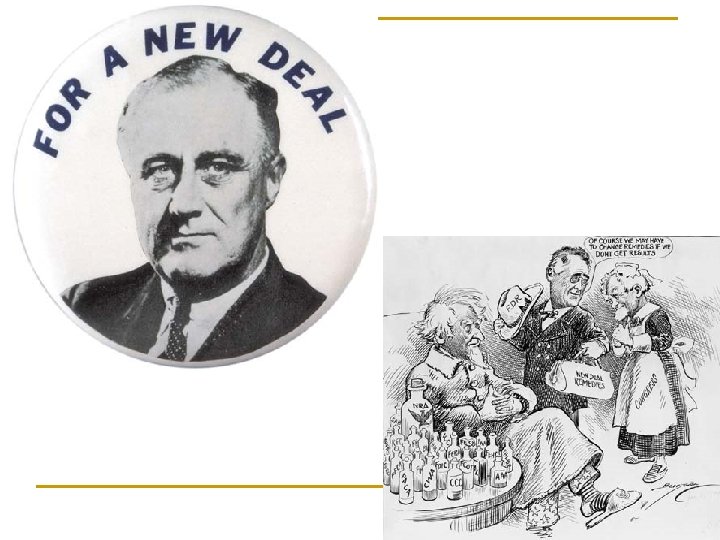 LEGACY OF NEW DEAL n n n Government’s role changed: q President and Fed. Gov’t becomes more powerful! q “Broker State” n Fed. Gov’t assists groups who are able to organize and exercise power(voting) to demand government action q Too many people rely on gov’t for job and $ Minorities: mixed results: women & blacks in FDR’s gov’t; discrimination from New Deal Continues the “reform tradition” Populists and Progressives Capitalism “saved”: Did NOT end the Great Depression (WWII did) q It helped Americans cope!
