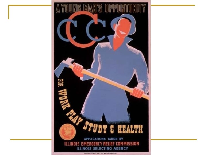 Relief Ø Relief Legislation 1. Civilian Conservation Corp (CCC) – jobs for young men – planting trees and cleaning up forests 2. Public Works Administration (PWA) – jobs building schools, roads, bridges