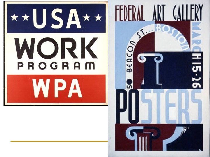 n n 3. Works Progress Administration (WPA) – jobs by hiring artists, writers and musicians to paint murals and produce plays. 4. Tennessee Valley Authority (TVA) – built dams to control floods and produce electricity
