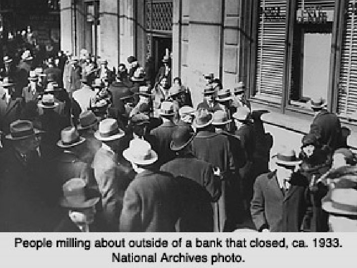 Bank Failures After the crash, many begin withdrawing money from banks ◦ Bank Runs ◦ Banks had invested other people’s moneys ◦ Millions of people lost their life savings Banks closed because withdrawals outnumbered deposits Bank Run