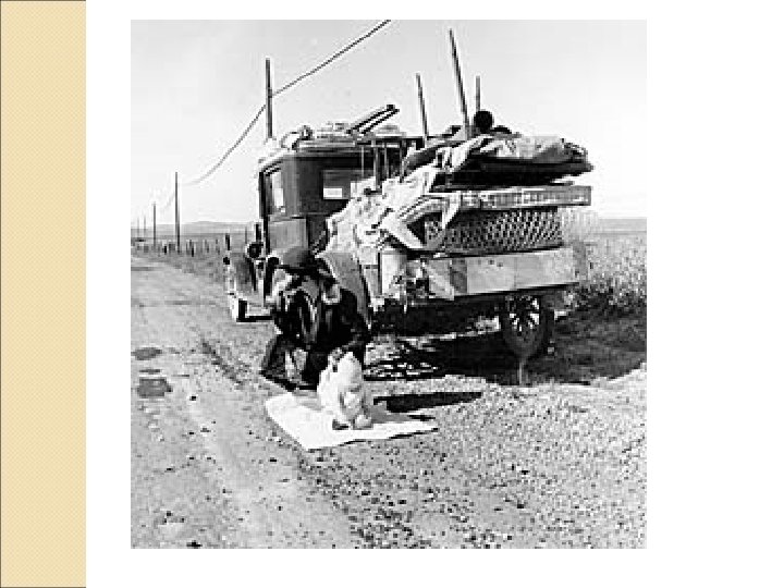 Dust Bowl Over production-land stripped of nutrients Drought-grass Okies and arkies- moved from these states out west to find jobs