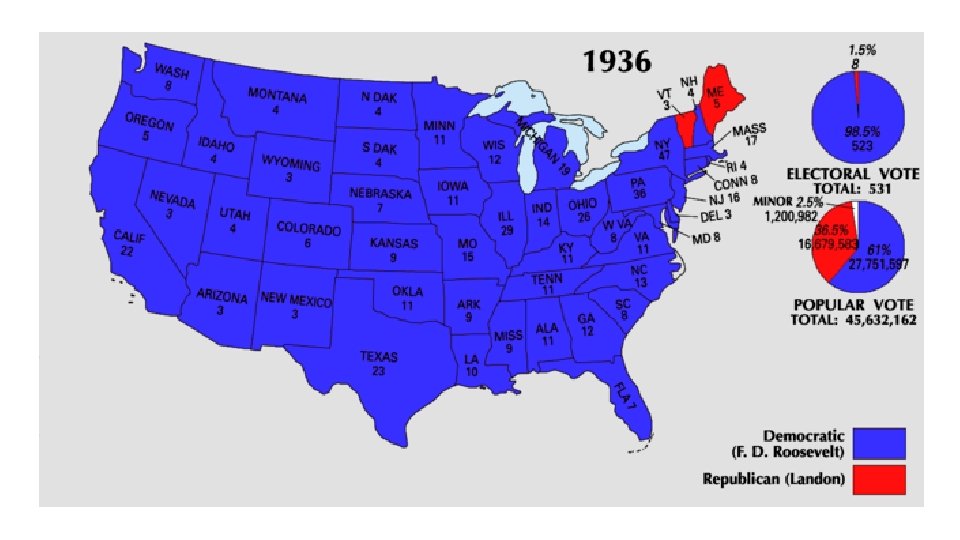 Election of 1936: Results • Historical election shift • Blacks rejected their traditional Republicans for the more responsive Democrats. • Republicans adopted the historic (southern) Democrat state’s rights position. • Big turnout, most one sided victory since Monroe in 1820, biggest ever Democrat win. • Roosevelt 27, 476, 673 to Landon 16, 679, 583; electoral 523 -8; all but six governorships and more control of both houses of Congress.