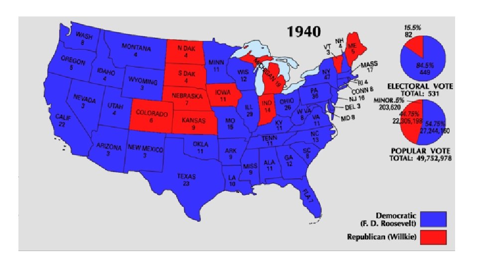 Election of 1940 • Roosevelt’s influence was decreasing by 1940 • The two-term tradition was widely accepted as part of the unwritten constitution. • In 1938, as a result of growing opposition to the New Deal, Congress began to reverse the taxation policy of the previous five years. • Wendell Willkie • Republican candidate for President in 1940 from NY • He was a powerful Wall Street lawyer with Democratic leanings and a long progressive record.
