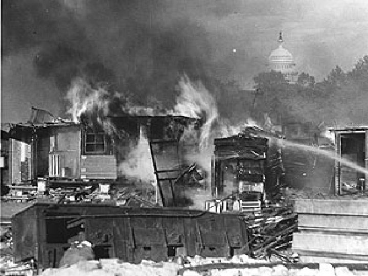 IT GOES FROM BAD TO WORSE – The Bonus Army n 1932 - WWI Veterans were promised a Bonus they could collect in 1945. But they wanted it now. Over 100, 000 of them Marched to Washington D. C. n They call themselves the Bonus Army n Sen. Wright Patman was on the side of the veterans. He introduced the Patman Bill but it got voted down. n Most of the Bonus Army left, but 2, 000 stayed.