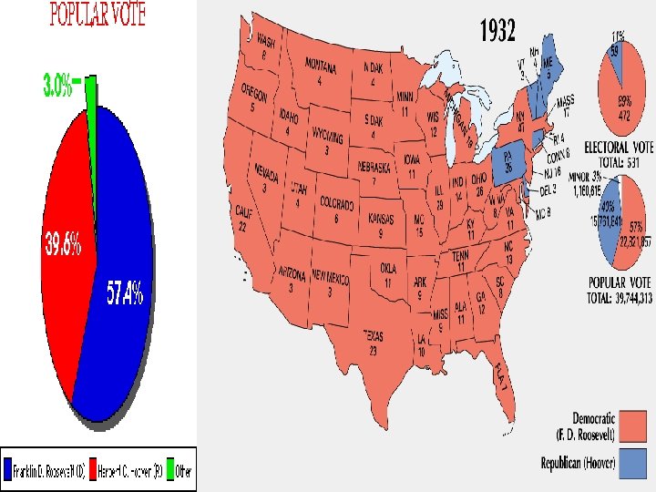 Americans Get a New Deal Election of 1932 Roosevelt Hoover: blamed for doing too little Campaigns free enterprise and individualism FDR: (D) v. Hoover (R) reform minded—”forgotten man” Champions a “New Deal” relief for needy, economic recovery, and financial reform Roosevelt wins The 20 th amendment Hoover encourages anti-inflationary policies Democrats gain control of the House and Senate
