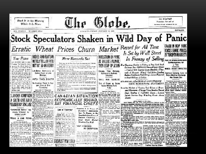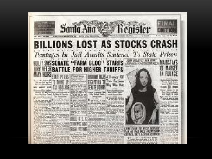 THE STOCK MARKET • In the 1920’s the stock market soared and people speculated with stocks • Many people borrowed money to pay for stocks, called buying on margin • There was no regulation of the market & some companies altered stock values to raise profits • October 29 th, 1929 (Black Tuesday) the stock market crashed • Black Tuesday – You. Tube video