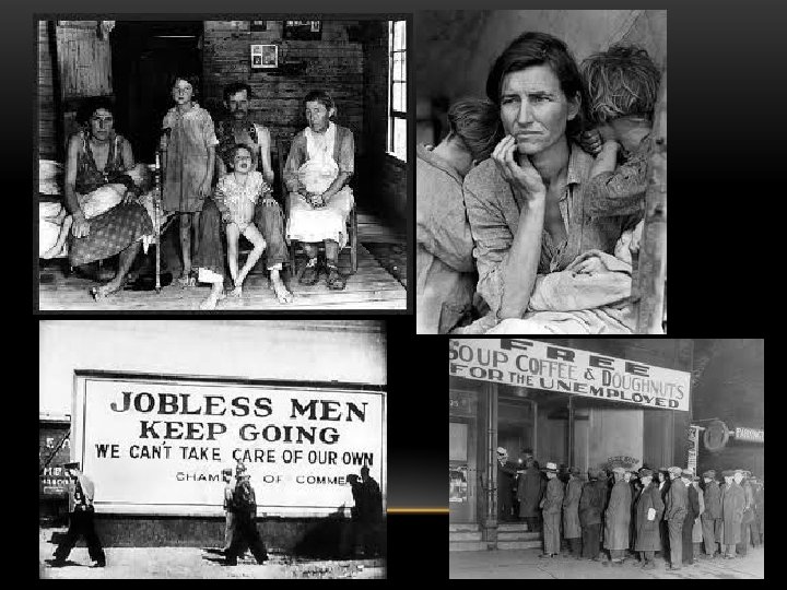 EFFECTS OF THE GREAT DEPRESSION • Led to a collapse of the US financial system • 25, 000 banks and 90, 000 businesses failed by 1933 • Unemployment peaked at 25% • Many Americans lost their homes • America had record poverty & suicide rates; fathers abandoned families; healthcare declined (many children died of malnutrition) • Private charities created soup kitchens and breadlines to help