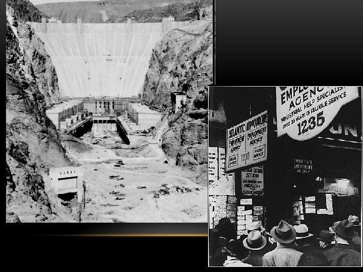 PRESIDENT HOOVER’S RESPONSE TO THE GREAT DEPRESSION • President Hoover initially rejected bold gov’t action • He tried to reassure Americans that prosperity would return • He called for volunteerism & “rugged individualism” – Americans need to work • He eventually called for more gov’t action: • Relief checks to help the unemployed • The Reconstruction Finance Corps (RFC) loaned money to businesses • Created building projects like Hoover Dam • These efforts did not end the depression and many citizens lost faith in Hoover • Americans who lost their homes lived in shantytowns nicknamed “Hoovervilles”