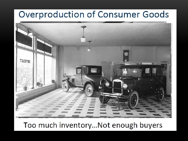 WEAK INDUSTRIES & OVERPRODUCTION • Mass-production of consumer goods led to overproduction (because of WWI) • People did not need as many consumer goods and began buying less (under consumption) • Railroads, textiles, steel, coal mining, and construction were barely profitable • Demand for agricultural products declines • Too much food leads to a drop in crop prices • Farmers can’t afford to pay back loans and their farms foreclosed