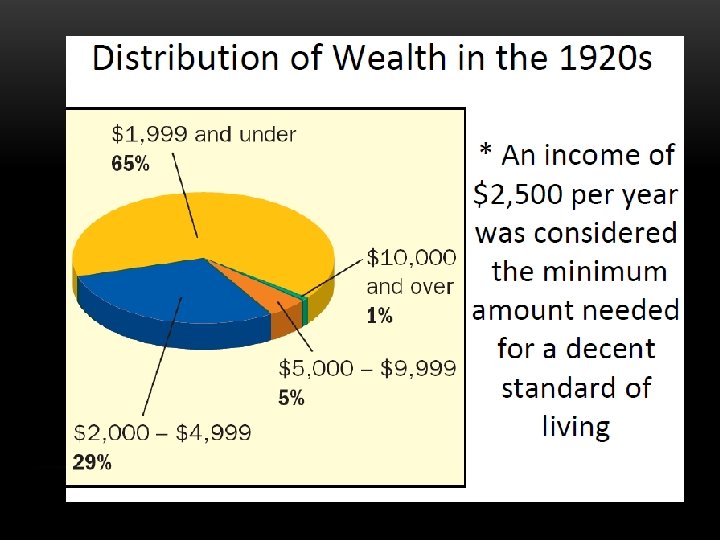 UNEVEN DIVISION OF WEALTH • Despite rising wages, the gap between the rich & poor grew wider in the 1920’s • 70% of Americans were considered “poor” • Most of the spending was done by 30% of the population