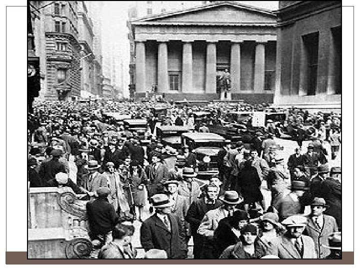 The Stock Market Crashed, 1929 The Great Crash of Wall Street, 1929 In September 1929 stock prices began to fall rapidly Investors started to sell shares—which led to more decline in the market October 29=”Black Tuesday”—the bottom fell out of the market. Over 6 million shares were sold and entire fortunes were lost. Note: The Crash did not cause the Depression!