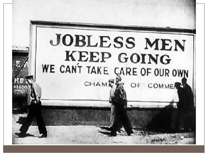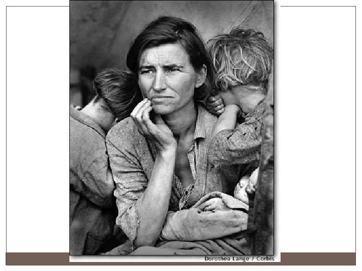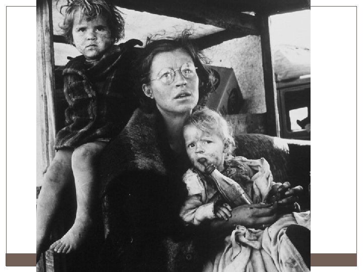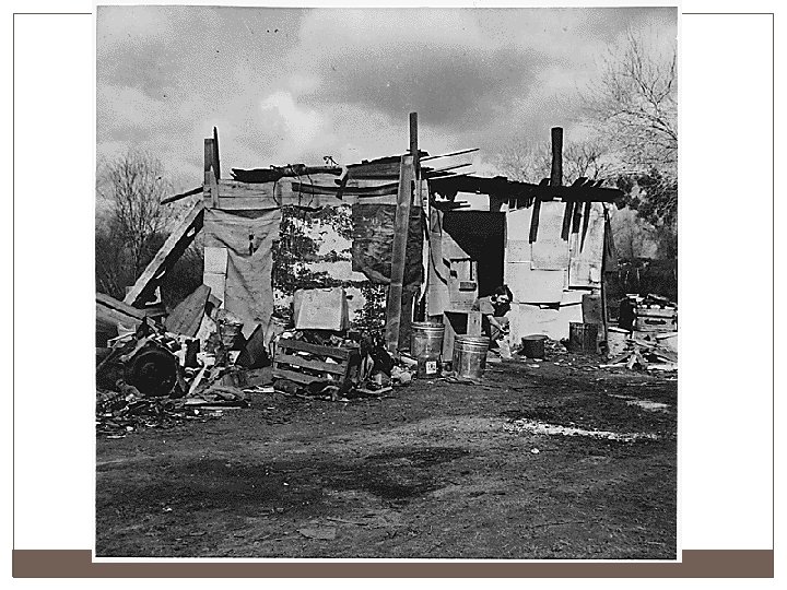 Poverty Devastated Rural America Commodity prices plunged Farmers lost their farms and became Tenant farmers (working for larger farmers) Great Plains became a Dust Bowl Desperation caused migration-people moved to find jobs Riding the rails “Okies” migrants from Oklahoma