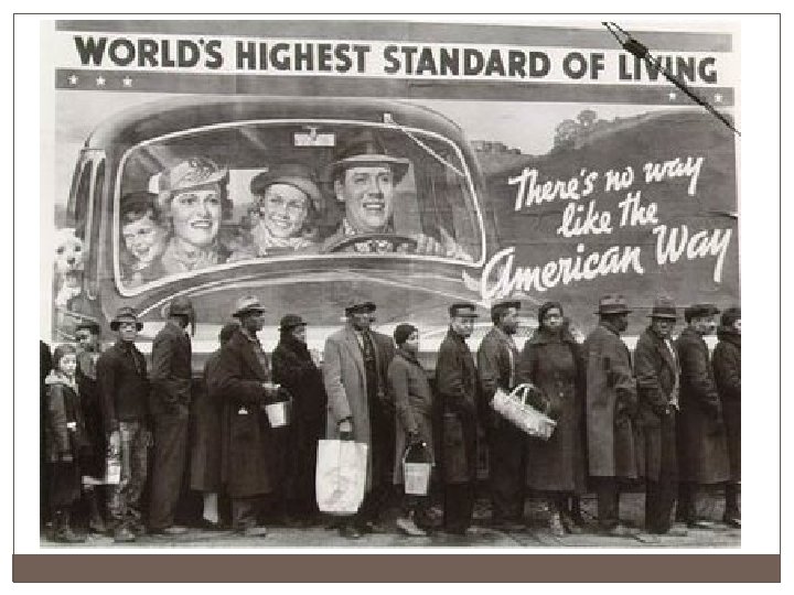 How Did the Great Depression Impact the American People? 1. 2. 3. 4. 5. 6. Had to seek unemployment and relief benefits from the government Bread lines and soup lines formed. There was hunger in America One third of farmers lost their land Unemployment reached 25% Mass migrations: Americans moved from place to place (migrated) Number of homeless increased: Shanty towns called Hoovervilles sprung up
