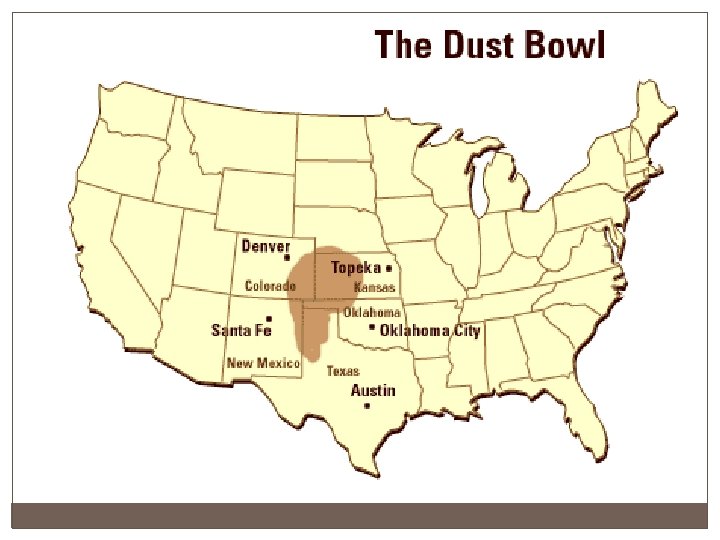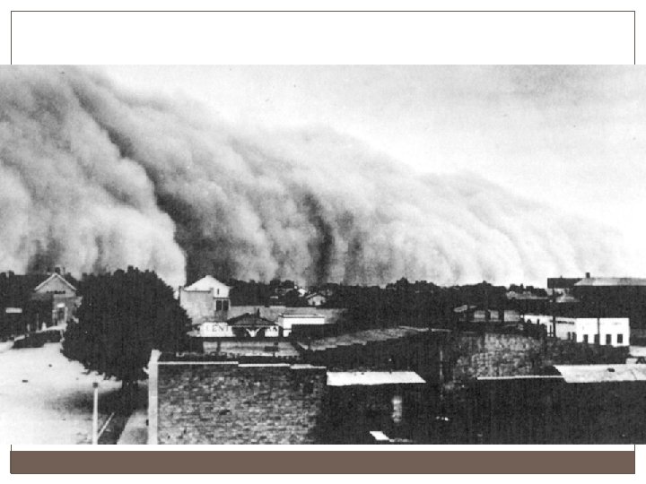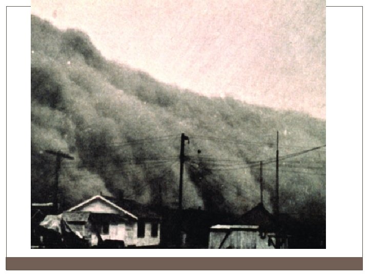 What was the Dust Bowl? Droughts and the plowing of plains grasses caused an environmental disaster—”Dirty Thirties” Massive dust storms swept across the Great Plains Led to a mass migration of Americans from the Plains to other regions of the US
