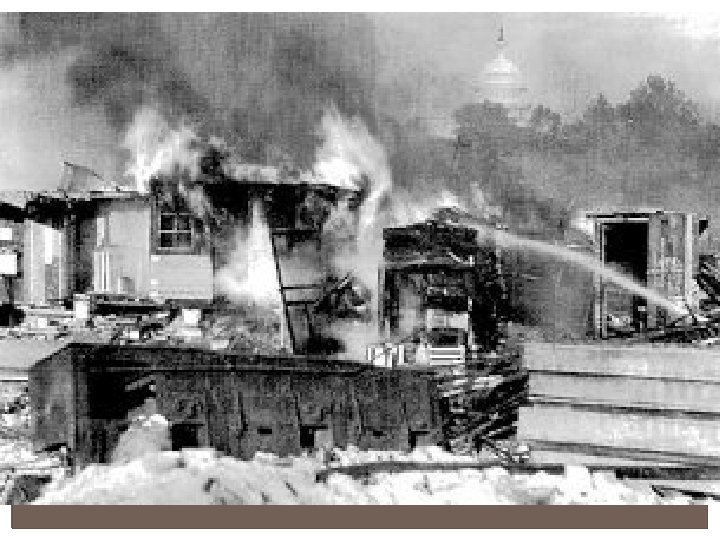 The Final Straw: The Bonus Army (1932) Bonus Army— 20, 000 WWI Veterans marched on Washington, D. C. , demanding the early payment of bonuses from the government. Hoover sent in troops to disband the veterans. General Douglas Mac. Arthur Dwight Eisenhower George Patton Several veterans were injured. Hoover was blamed.