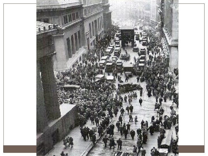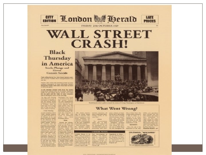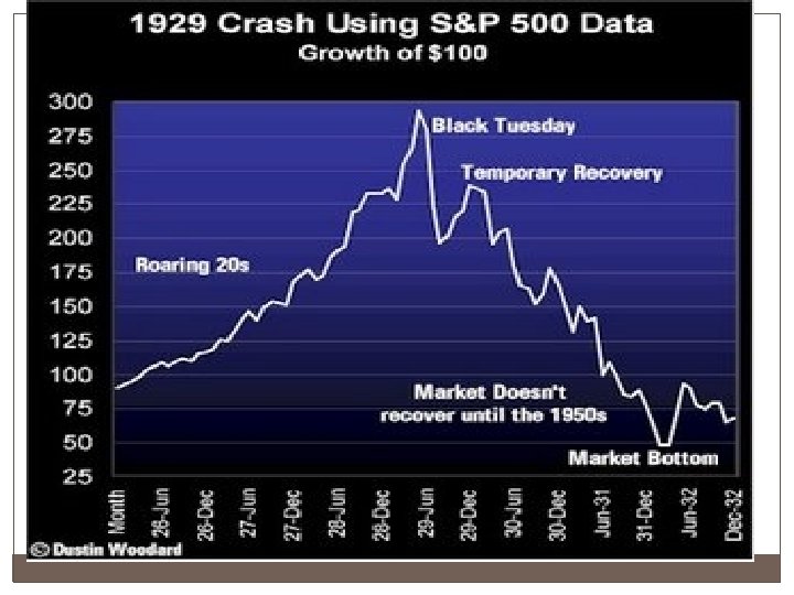 The Stock Market Crashed, 1929 The Great Crash of Wall Street, 1929 In September 1929 stock prices began to fall rapidly Investors started to sell shares—which led to more decline in the market October 29=”Black Tuesday”—the bottom fell out of the market. Over 6 million shares were sold and entire fortunes were lost. Note: The Crash did not cause the Depression!
