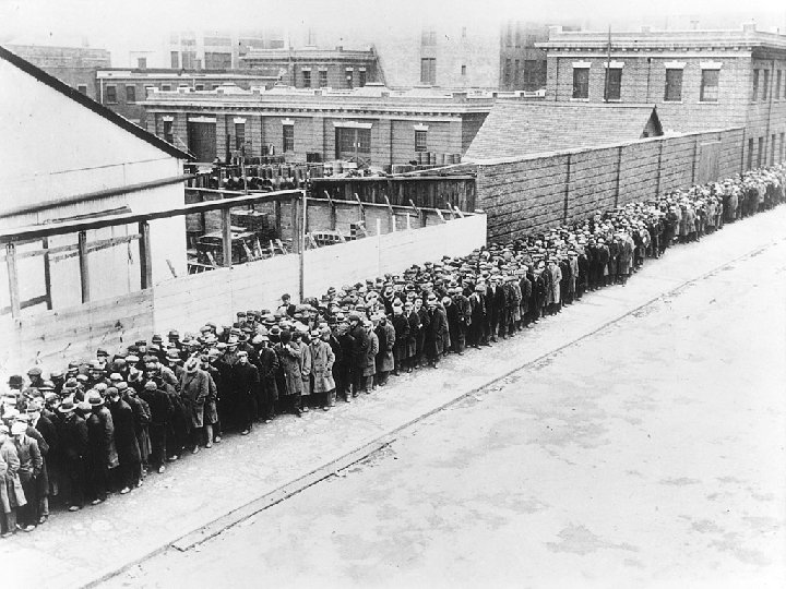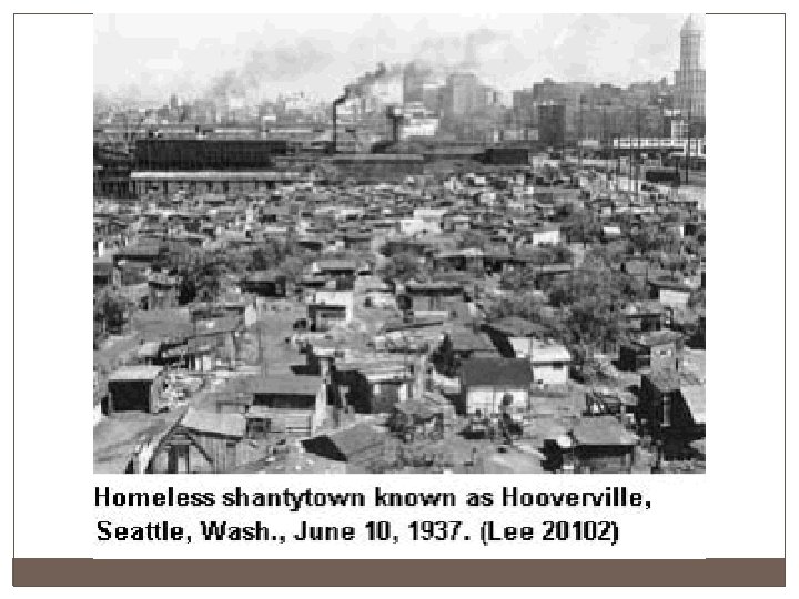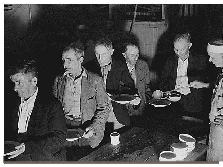How Did the Great Depression Impact the American People? 1. 2. 3. 4. 5. 6. Had to seek unemployment and relief benefits from the government Bread lines and soup lines formed. There was hunger in America One third of farmers lost their land Unemployment reached 25% Mass migrations: Americans moved from place to place (migrated) Number of homeless increased: Shanty towns called Hoovervilles sprung up
