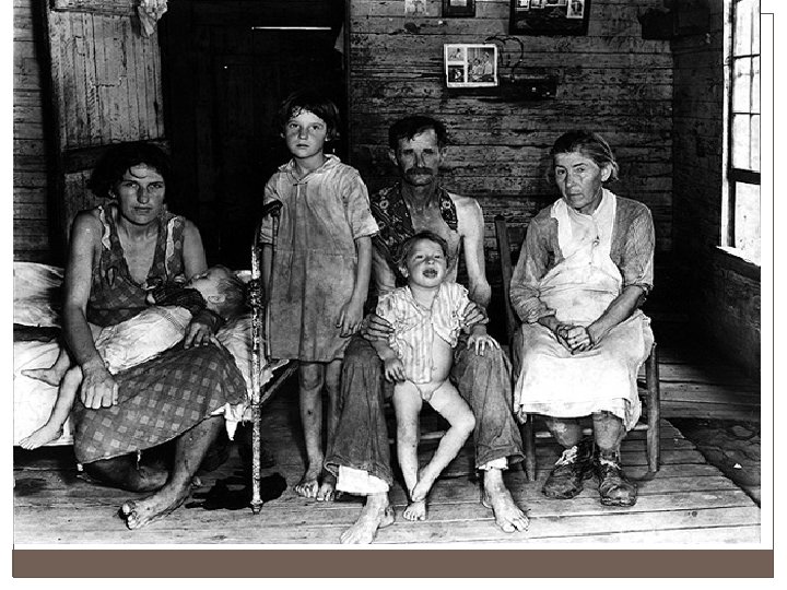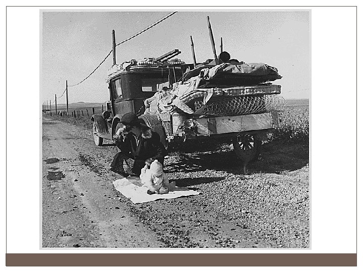 Poverty Devastated Rural America Commodity prices plunged Farmers lost their farms and became Tenant farmers (working for larger farmers) Great Plains became a Dust Bowl Desperation caused migration-people moved to find jobs Riding the rails “Okies” migrants from Oklahoma