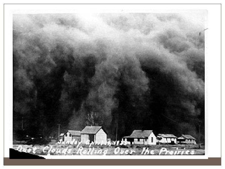 What was the Dust Bowl? Droughts and the plowing of plains grasses caused an environmental disaster—”Dirty Thirties” Massive dust storms swept across the Great Plains Led to a mass migration of Americans from the Plains to other regions of the US