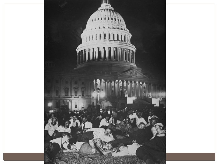 The Final Straw: The Bonus Army (1932) Bonus Army— 20, 000 WWI Veterans marched on Washington, D. C. , demanding the early payment of bonuses from the government. Hoover sent in troops to disband the veterans. General Douglas Mac. Arthur Dwight Eisenhower George Patton Several veterans were injured. Hoover was blamed.