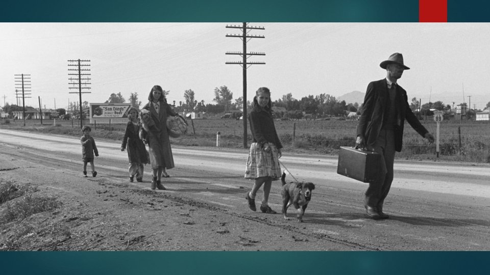 What is the tone of the picture? Is it happy? Sad? Why? What do the families clothes look like? Are there any articles of clothing that tell us something about them? Why is the dog on a leash? Do you think it’s a farm dog? What does this tell us about the family? What is the father carrying? What kind of job do you think he had before? Do you think he will be able to find work? Where do you think this family slept last night?