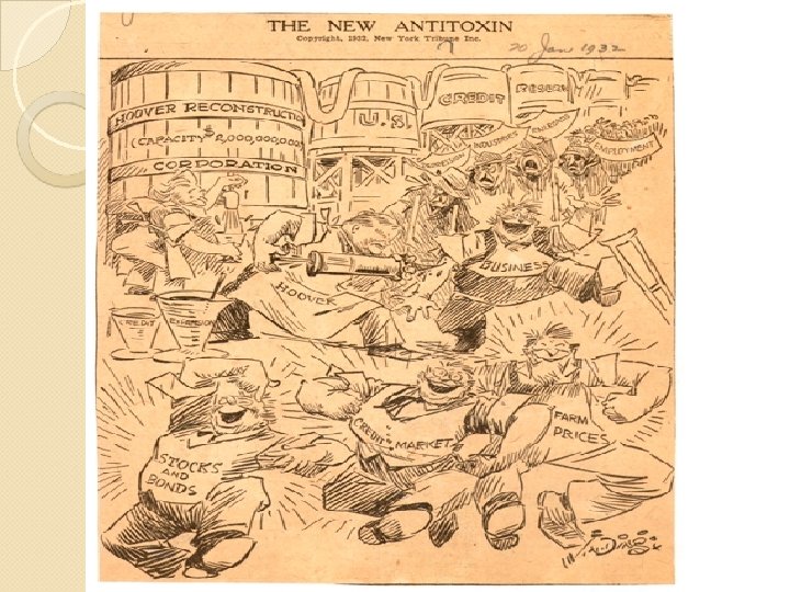 Midterm Shellacking and Change In 1930, Republicans lost 52 seats in the House and held on to the Senate by a single vote. • The new Congress had to make sure that banks could make loans to corporations so they could expand production and rehire workers. • Hoover asked Congress to establish the National Credit Corporation (NCC). – NCC created a pool of money to enable troubled banks to continue lending money in their communities. • Established because Federal Reserve refused Hoover’s request to put more currency into circulation. • Hoover requested that Congress set up the Reconstruction Finance Corporation (RFC). – RFC. would be used to make loans to banks, railroads, and agricultural institutions • By spring of 1932 the RFC had lent over $238 million to estimated 160 banks, 60 railroads, and 18 building and loan organizations. • Too overly cautious and failed to increase its loans in sufficient amount to meet the need. • Issue loans to states that no longer had enough resources to help the needy. •