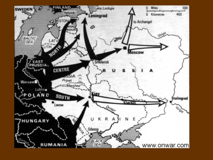 The Invasion of Russia • After failing to take Great Britain, Hitler turned his focus on Russia. • In June of 1941, the Germans launched a massive attack on the Soviet Union code named Operation Barbrossa. • Hitler wanted Russia for more “living space” and for lebensraum. • As the Germans defeated the Soviets and moved farther into Russia, Stalin ordered a slash and burn. • By November, the German’s had advanced almost to Leningrad and taken major cities but the Soviets refused to _Give-up. • The Germans will attempt to take Stalingrad for its industry and because it was named after the Soviet leader. (A blow for Soviet morale. ) • Stalin ordered the city to be held at all costs. The Soviets counterattack the Germans encircled their army and cut off their supply lines. • The Battle of Stalingrad proved to be the turning point of the war. • The back of the Nazi army was broken as thousands of Germans were killed and taken prisoner. (180, 000)