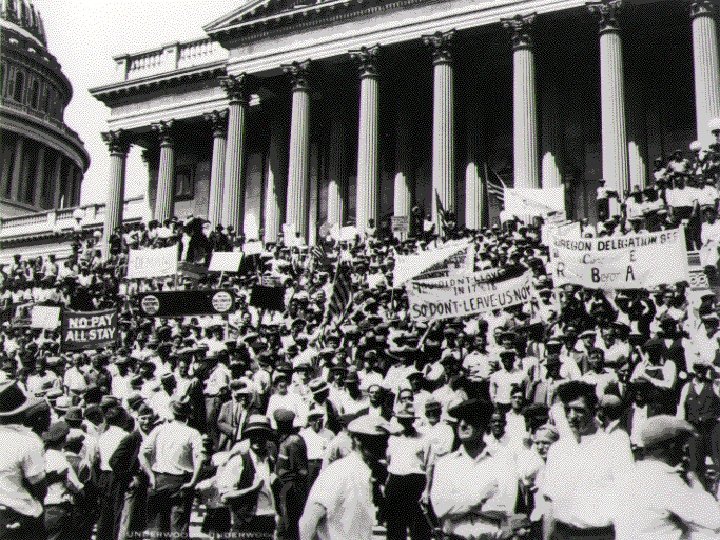 Despair and Protest Suicide rate 30% in 1932 Unrest on farms Farmers banded together to stop banks from foreclosing farms Farm Holiday Association Bonus march Summer 1932 One of the worst years of depression 1, 000 unemployed WWI vets marched to Washington to demand payment of bonuses Bonuses scheduled to be paid in 1945 Joined by thousands more Violent clash Mac. Arthur called in to “disperse” crowd 1, 000 troops Eisenhower, Patton there Negative pubic reaction More than 100 casualties 2 babies