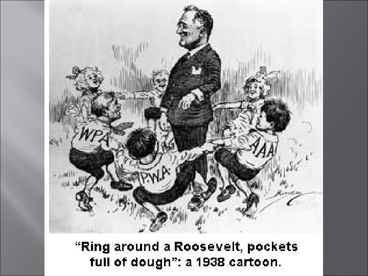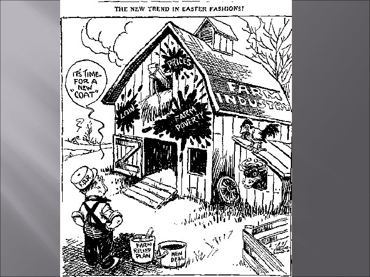 100 days continued Relief for the unemployed Federal Emergency Relief Administration Industrial recovery 1 st welfare program Grants of federal money to states and local governments for soup kitchens, other relief 1 st National Recovery Act Government control of production, labor and costs NRA would enforce it Attempt to guarantee reasonable profits for business and fair wages and hours for labor Gave workers right to organize Used by Frances Perkins to ban child labor $500 million to state and local agencies Public Works Administration Money to build roads, bridges, dams, other pubic works Civilian Conservation Corps Employed young men on projects on federal lands (18 - 25) Worked relief with environmental programs By 1935 - 500, 000 employed Tennessee Valley Authority Hydroelectric power program National Recovery Administration 1933 Farm production control Agricultural Adjustment Administration Encouraged to reduce production, raise farm prices Paying farmers not to plant