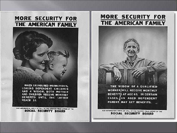 Social Security Act 1935 Most important of all new deal laws Drafted by Frances Perkins Created federal insurance program based on automatic collection of taxes from employees and employers throughout working career Caused brief recession in 1937 Trust fund would pay monthly payments to retired over age 65 Establishe the principle of federal responsibility for social welfare Laid foundation Also receiving benefits under law: Unemployed Disabled Dependent children and mothers