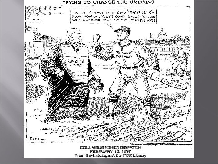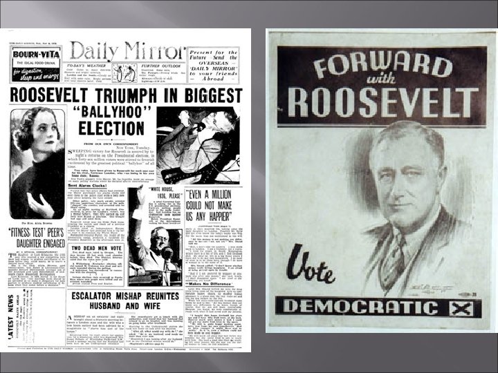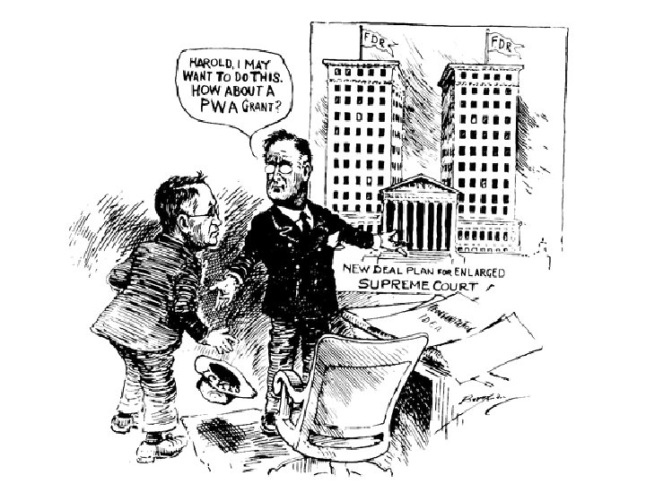 Election of 1936 Economy had improved but still weak and unstable Democrats Re-nominated F. D. R. Enormously popular among workers and small farmers “one issue, its myself, and the people must either be for me or against me” Republicans Nominated Alf London Supported by Business Part of American Liberty League Group of business leaders that opposed F. D. R. Fiscal conservative Results Landslide victory for F. D. R. Greatest asset ability to restore confidence New coalition of democratic voters African-Americans VERY important!!