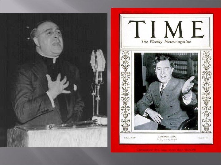 Opponents of the New Deal Liberal Critics Socialists, extreme liberals Demagogues Clifford Odet -Waiting for Lefty 1935 Weekly radio broadcasts Said N. D. did too much for business and too little for unemployed and working poor Wanted to nationalize banks Called F. D. R. the “great betrayer” and a liar From Detroit Thought government had too much power Relief programs bordered on Socialist American Liberty League Al Smith Dr. Francis Townsend Hero to senior citizens Proposed 2 % federal sales tax to pay retired $200 a month Conservative Critics Father Charles Coughlin Required to spend $ within 30 days Huey Long “Kingfish” Gov. from Louisiana “Share our wealth” 100% income tax over 1 million dollars Everyman would be a King Ran for Presidential nom. Attempted assassination