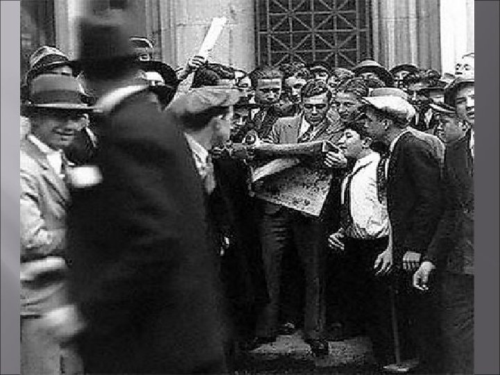 Stock Market Crash Rising stock market symbol of prosperity during 1920 s “conspicuous prosperity” Paper wealth (credit) masked rot in American Economy Before crash: September 3, 1919 the Dow Jones Industrial Average of major stocks reached an all-time high of 381 Stock prices plunged Next day, bankers bought millions in stocks to stabilize prices Led by J. P. Morgan Jr. Stocks steadily increased from March 1928 to September 1929 October 24, 1929 Unprecedented volume of selling 13 million shares Unemployment already high due to mechanization in factories Housing starts feel in 1927 Internationally production up and demand down Black Thursday Black Tuesday October 29, 1929 Bottom fell out Investors wanted to sell stock 16 million shares By November average down to 198, in three years hit all time low of 41 Wealth “vanished”