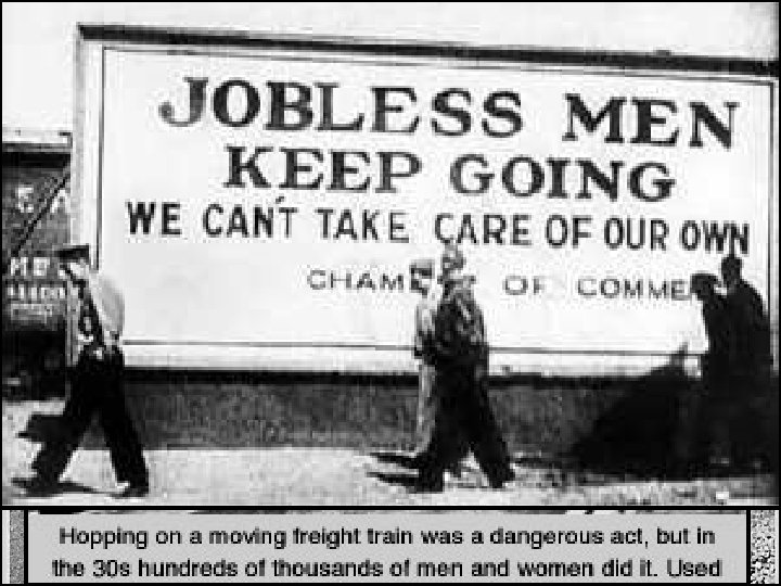 Effects of the Great Depression ■ The Depression hit all classes: –Many families lost their homes or farms & were forced to live in “Hoovervilles” –The U. S. saw unprecedented poverty & suicide rates; fathers abandoned their families; lawlessness ensued –The U. S. gov’t offered relief checks to the unemployed
