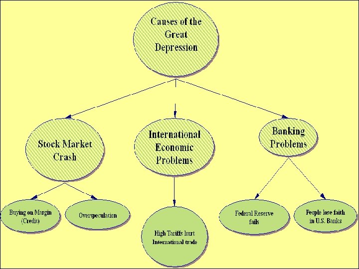 The Great Crash ■ An initial stock market crash on Oct 24, 1929 (Black Thursday) led to a catastrophic drop in stocks on Oct 29 (Black Tuesday) –Panicked investors sold stocks, causing stock prices to plummet –Banks lent less money, factories produced less, workers were fired or paid less → consumers had less money to spend → factories & businesses closed